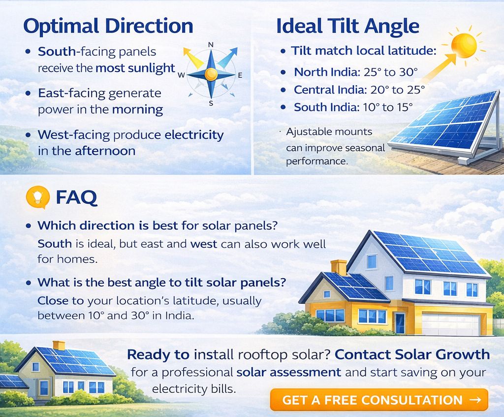 Choosing the right direction and angle for solar panels can make a significant difference in energy production. For most homes in India, south facing panels with a tilt angle close to the local latitude provide the best overall performance.Even if a roof does not face the ideal direction, modern solar installation techniques allow systems to be designed for different roof layouts.
