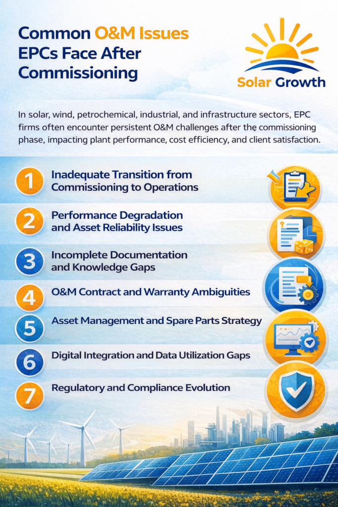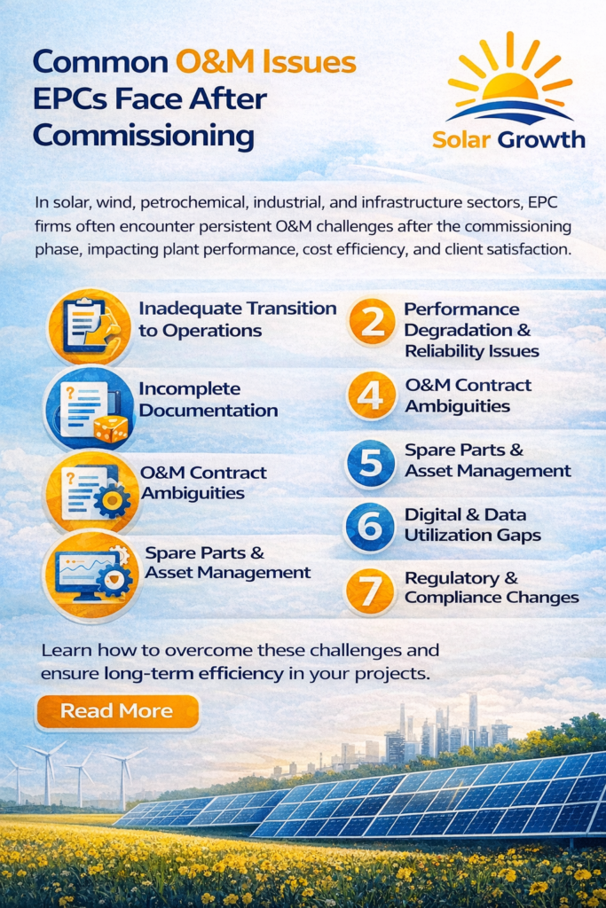In today’s complex project delivery environment across solar, wind, petrochemical, industrial, and infrastructure sectors, the transition from construction to long term operation is one of the most critical phases of an EPC project lifecycle. Even when commissioning is technically successful, many EPC contractors encounter persistent Operations and Maintenance challenges that affect plant performance, cost efficiency, and overall client satisfaction.