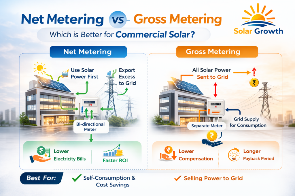Net metering generally provides better financial returns because businesses offset electricity at retail tariff rates. In gross metering, the compensation for solar power is typically lower than the price paid for grid electricity.