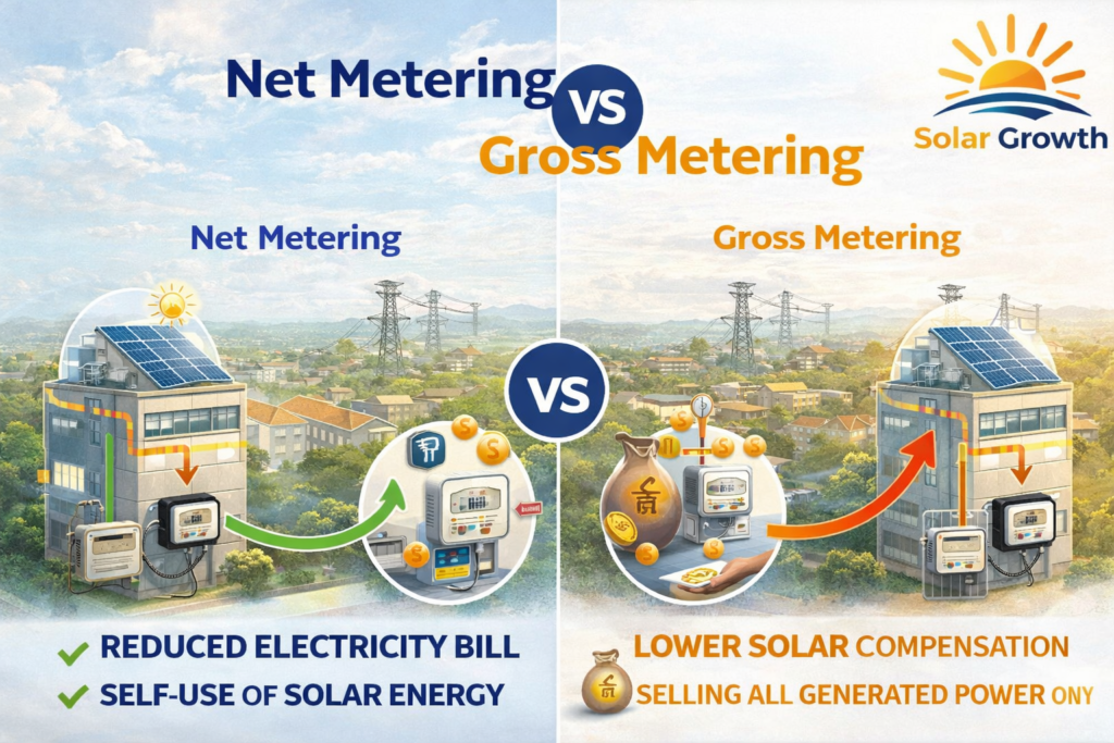 In net metering, solar energy is first used for self-consumption and only surplus energy goes to the grid. In gross metering, all generated power is sent directly to the grid.