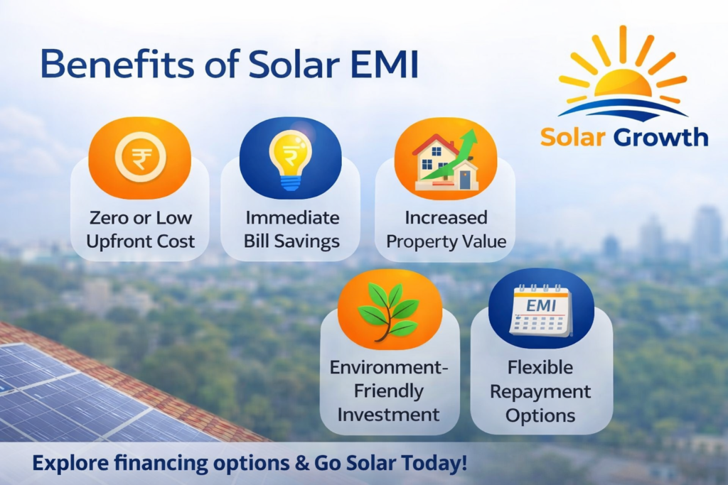 Many solar companies partner with lenders to offer zero or low down payment options. You can install a system and pay through monthly EMIs, often structured to match your savings on electricity. This reduces financial strain while still delivering immediate benefits.