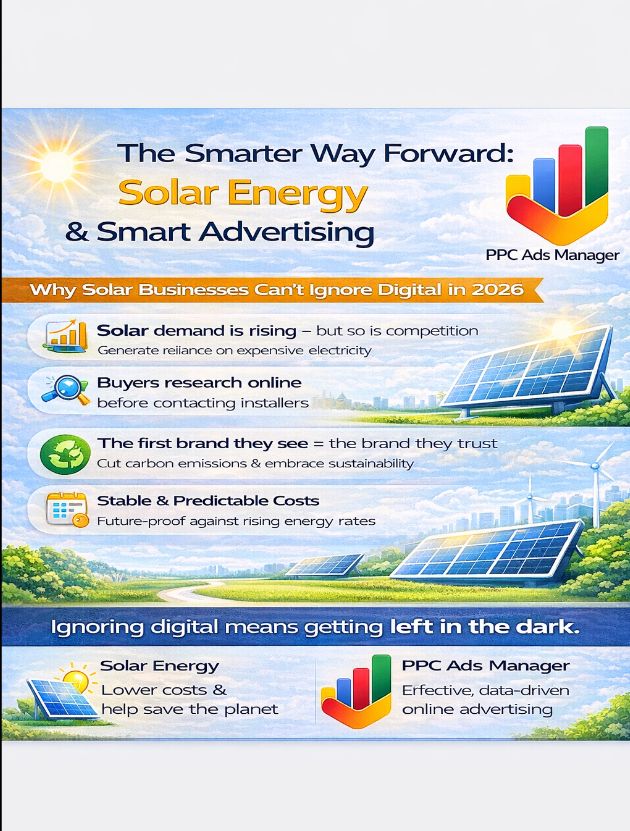 Rather than relying on random visibility or word-of-mouth alone, businesses actively invest in consistent, measurable growth. Well-managed advertising turns online searches into paying customers just as solar panels turn sunlight into usable power.Both are strategic investments that continue to benefit you long after the initial decision.A Future Built on Smart ChoicesThe world is changing rapidly. Energy consumption is increasing, environmental concerns are intensifying, and competition among businesses is growing fiercer every day.Solar energy represents the future of responsible power usage.Professional PPC management represents the future of smart business growth.